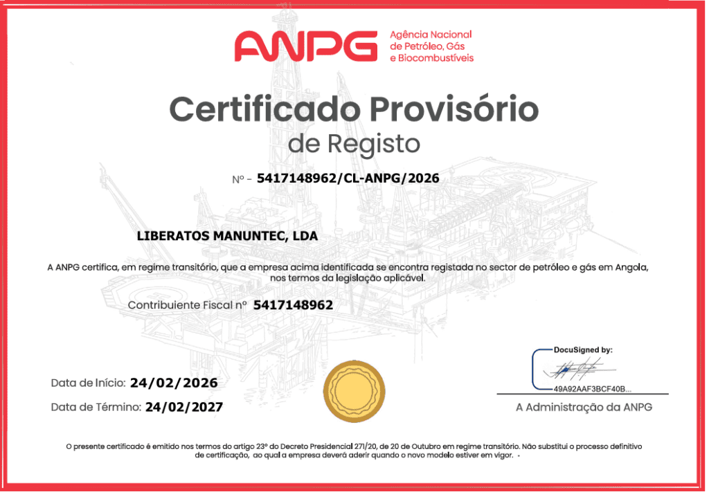 A empresa Liberatos Manuntec Lda, do Grupo Liberatos, recebeu o Certificado de Registo emitido pela Agência Nacional de Petróleo, Gás e Biocombustíveis (ANPG), documento que confirma o seu enquadramento formal no sector de petróleo e gás em Angola.